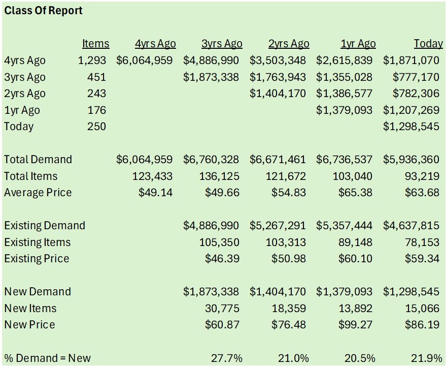 Here's one . . this category had problems last year. 4 Years Ago = $6. 1 million. 3 Years Ago = $6. 7 million. 2 Year Ago = $6. 7 million. 1 Year Ago = $6. 7 million. As of Today = $5. 9 million. The decrease happened in a growing business. This means ...
