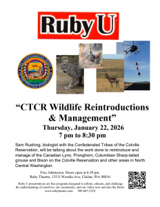 Ruby U: “CTCR Wildlife Reintroductions and management in North- Central Washington” presented by The Confederated Tribes of the Colville Reservation on January 22nd at 7:00 pm. FREE admission always.